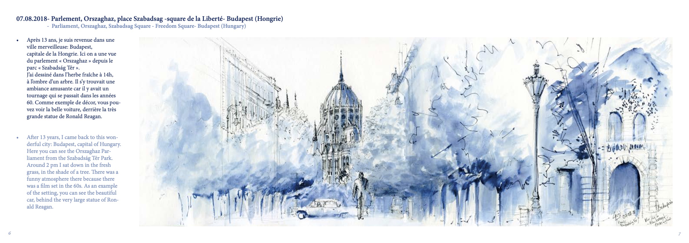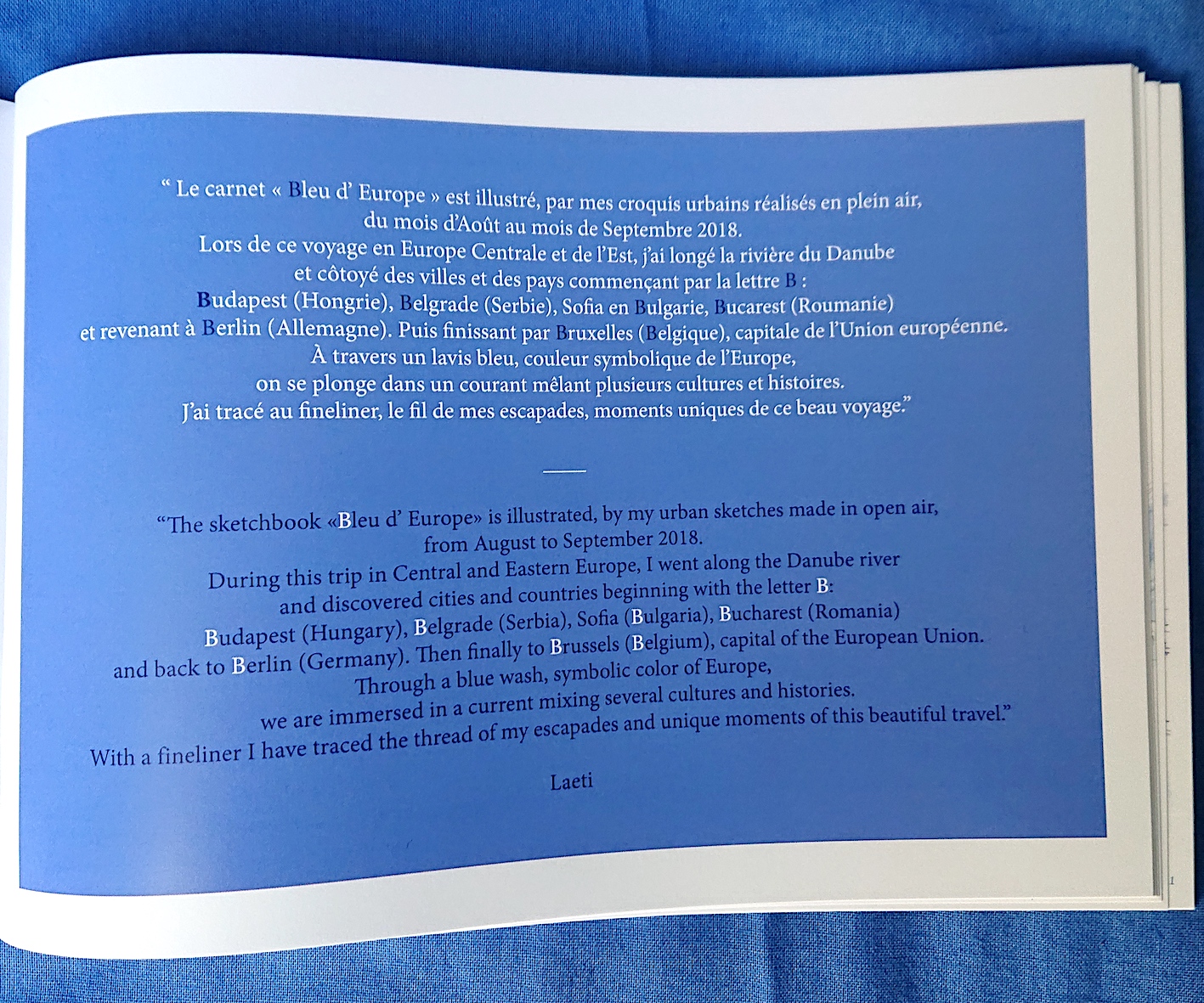 « Le carnet de croquis « Bleu d’ Europe » est illustré, par mes croquis urbains réalisés en plein air, d’août à septembre 2018. Lors de ce voyage en Europe centrale et orientale, j’ai longé le Danube et découvert des villes et pays commençant par la lettre B : Budapest (Hongrie), Belgrade (Serbie), Sofia (Bulgarie), Bucarest (Roumanie) et retour à Berlin (Allemagne). Enfin, Bruxelles (Belgique), capitale de l’Union européenne. A travers un lavis bleu, couleur symbolique de l’Europe, nous sommes plongés dans un courant mêlant plusieurs cultures et histoires. Au fineliner, j’ai tracé le fil de mes escapades et des moments uniques de ce beau voyage. » Laeti
