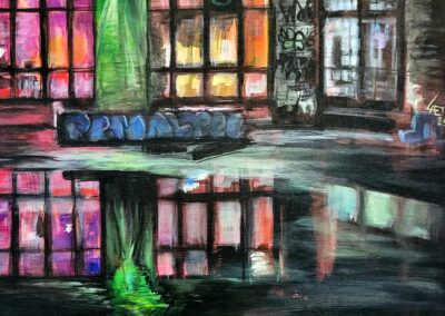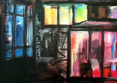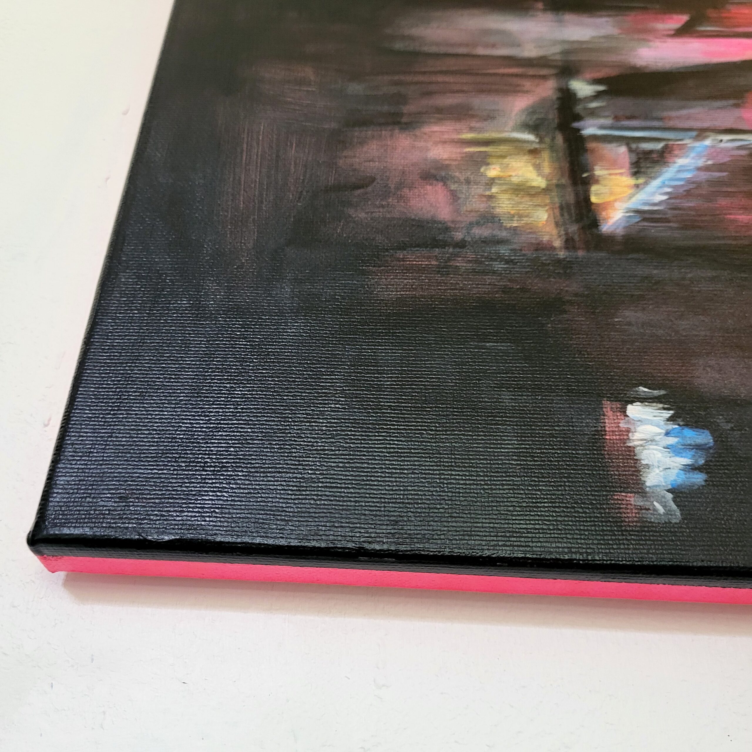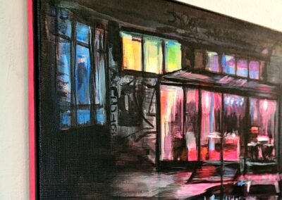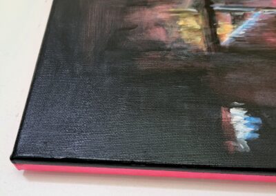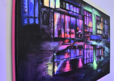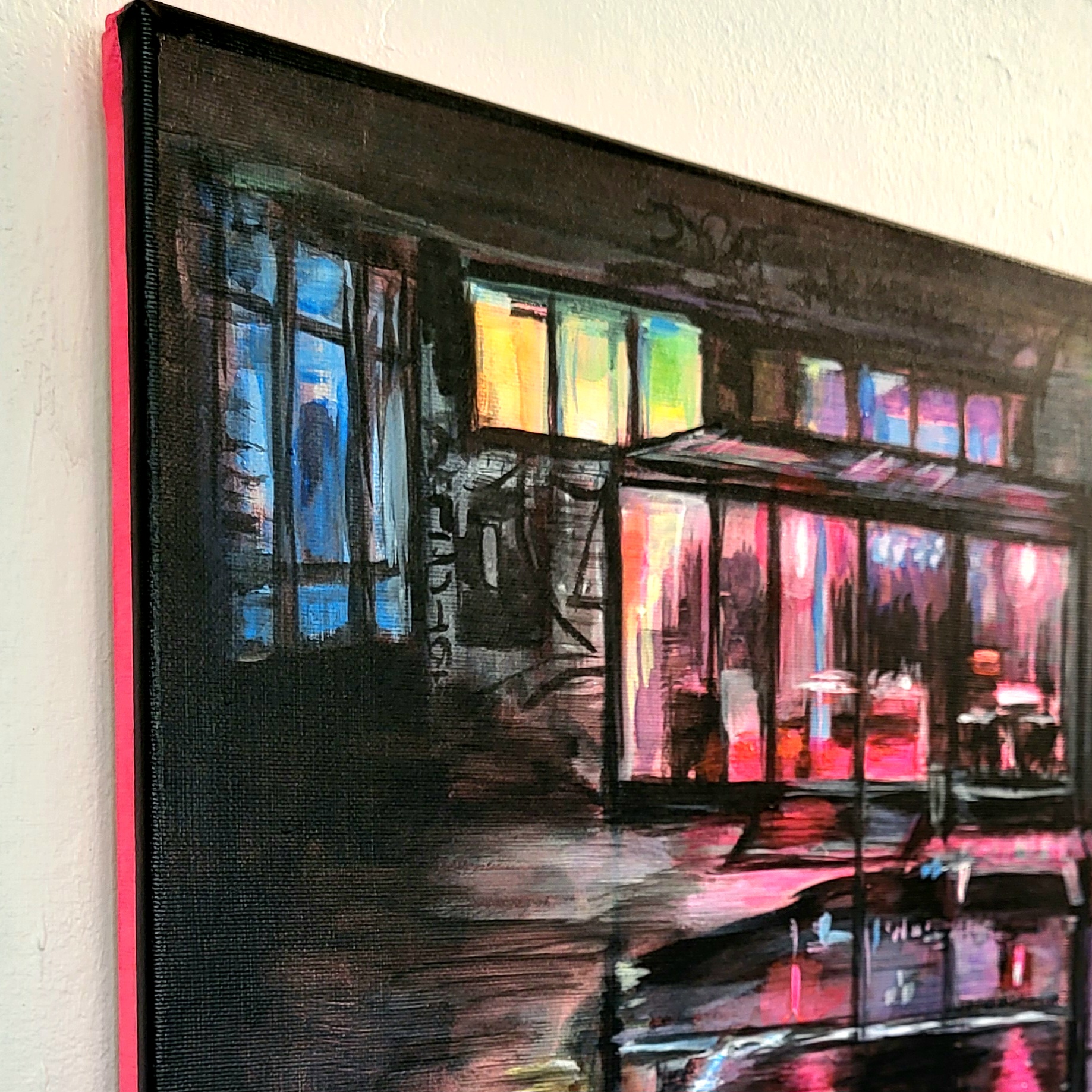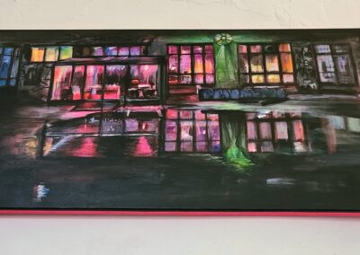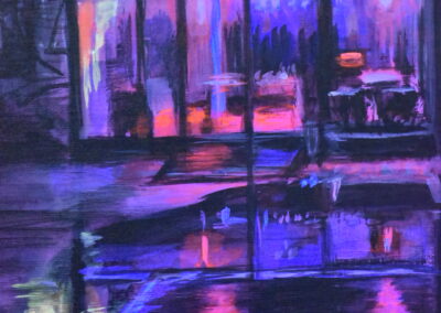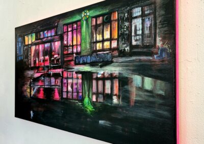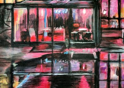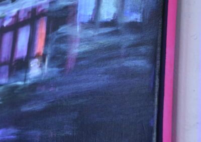 I wanted to capture the mysterious soul of a nighttime moment, where colorful lights vibrate on the water, blending figuration and impressionism. Using acrylic paint, I sought to reveal an atmosphere that is both tangible and metaphysical, inviting the viewer to immerse themselves in an urban reverie. This work fills the space with a gentle, almost hypnotic energy that illuminates the darkness with warmth and poetry.