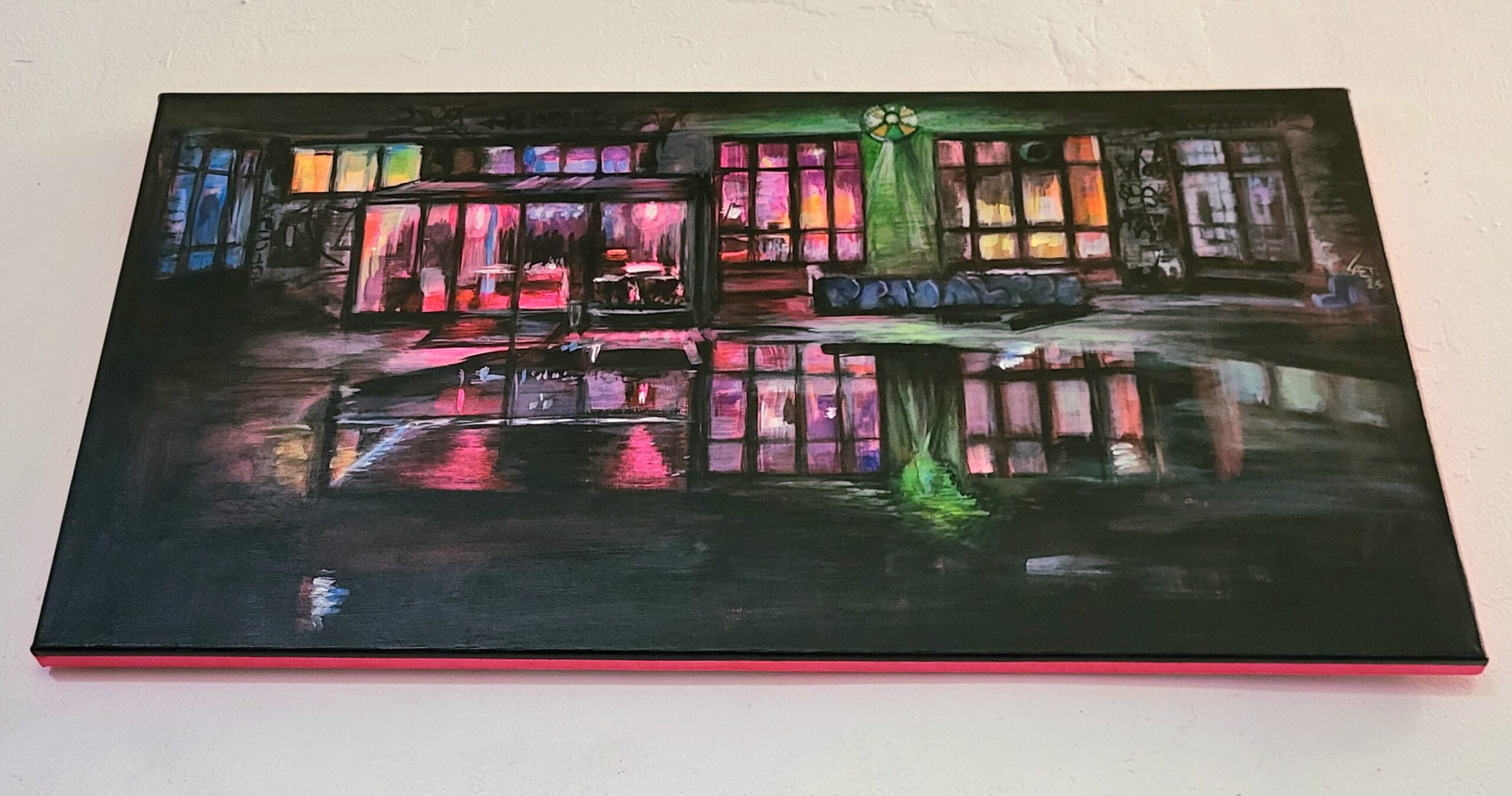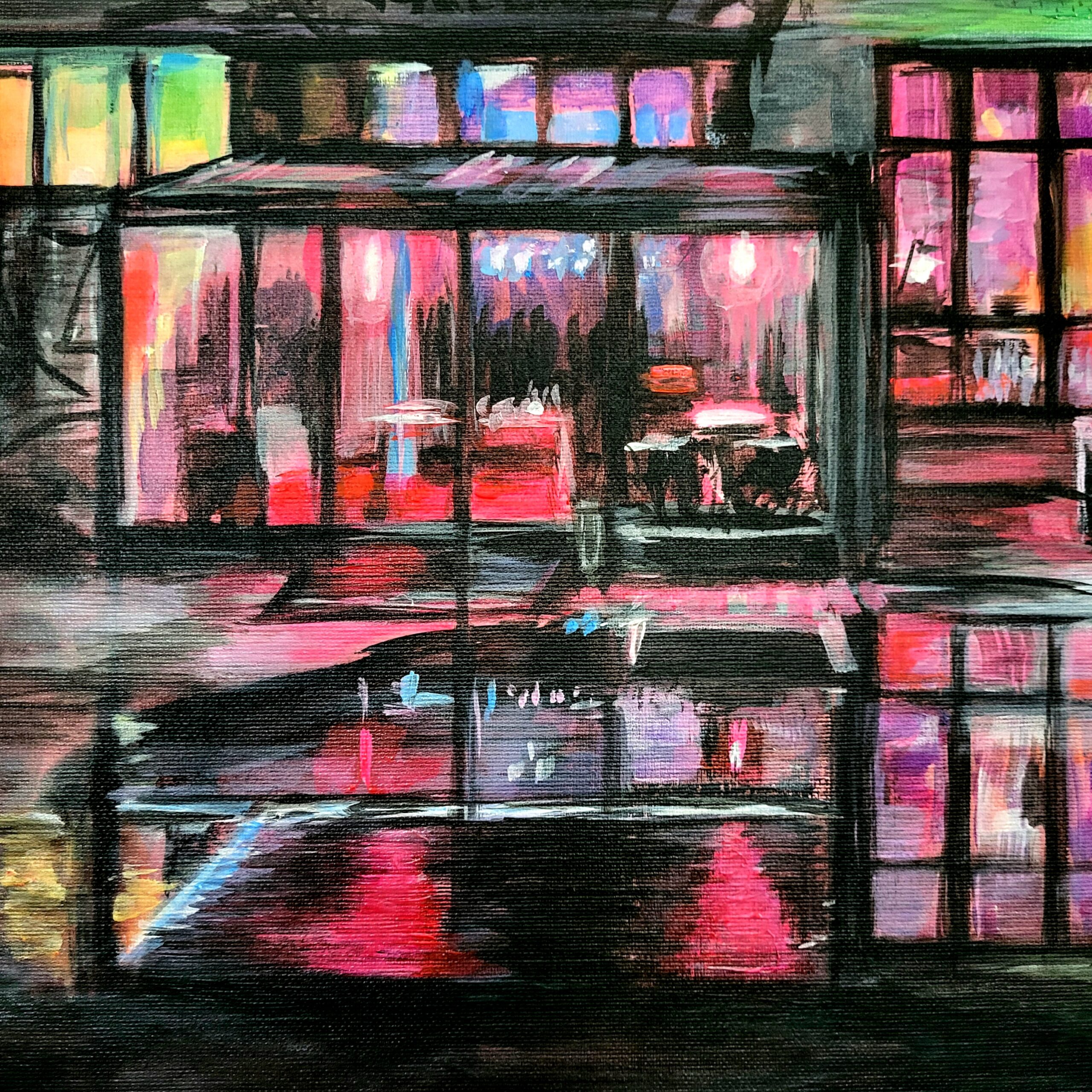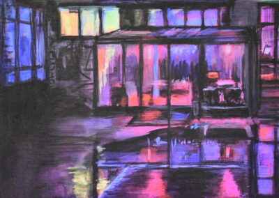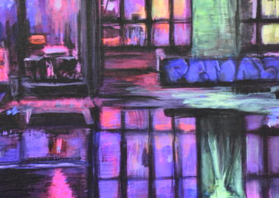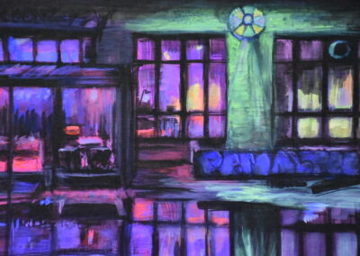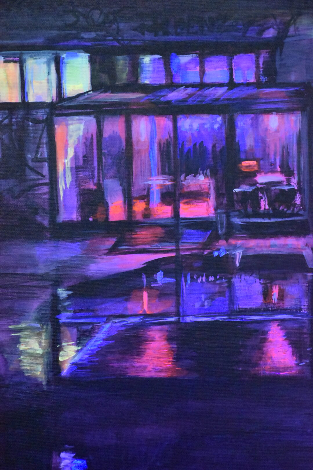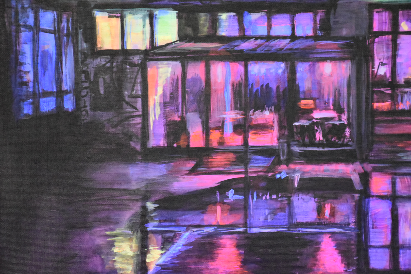I wanted to capture the mysterious soul of a nighttime moment, where colorful lights vibrate on the water, blending figuration and impressionism. Using acrylic paint, I sought to reveal an atmosphere that is both tangible and metaphysical, inviting the viewer to immerse themselves in an urban reverie. This work fills the space with a gentle, almost hypnotic energy that illuminates the darkness with warmth and poetry.