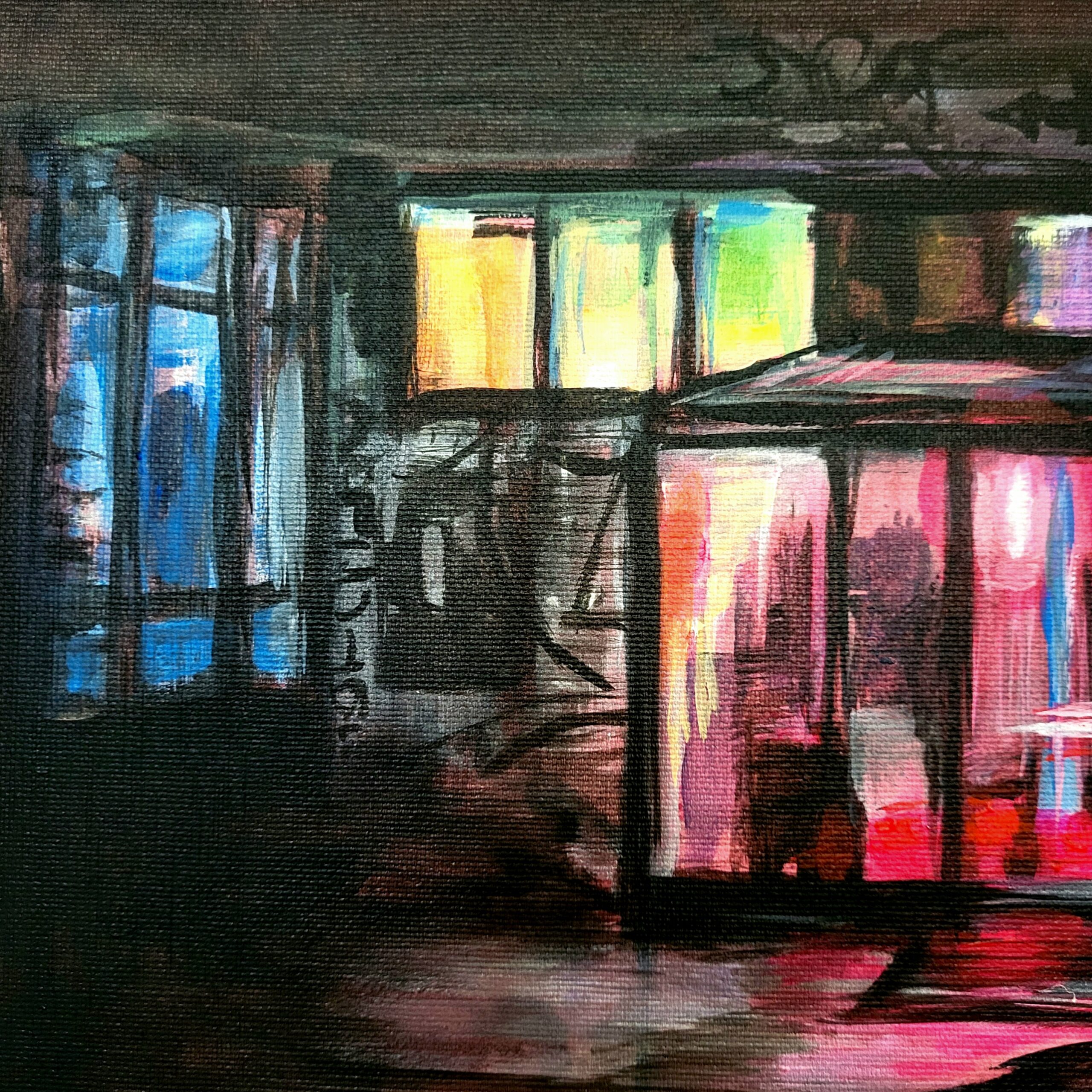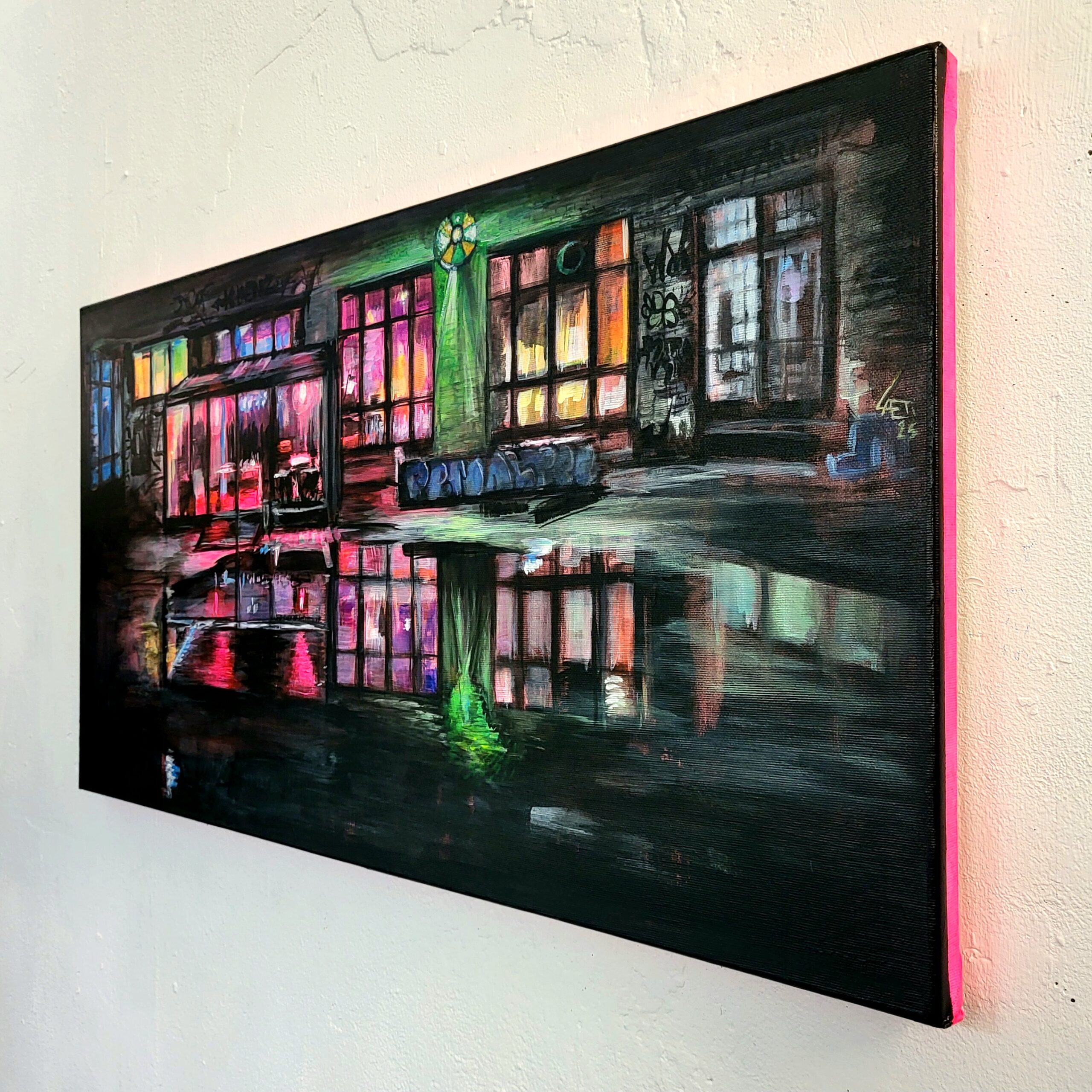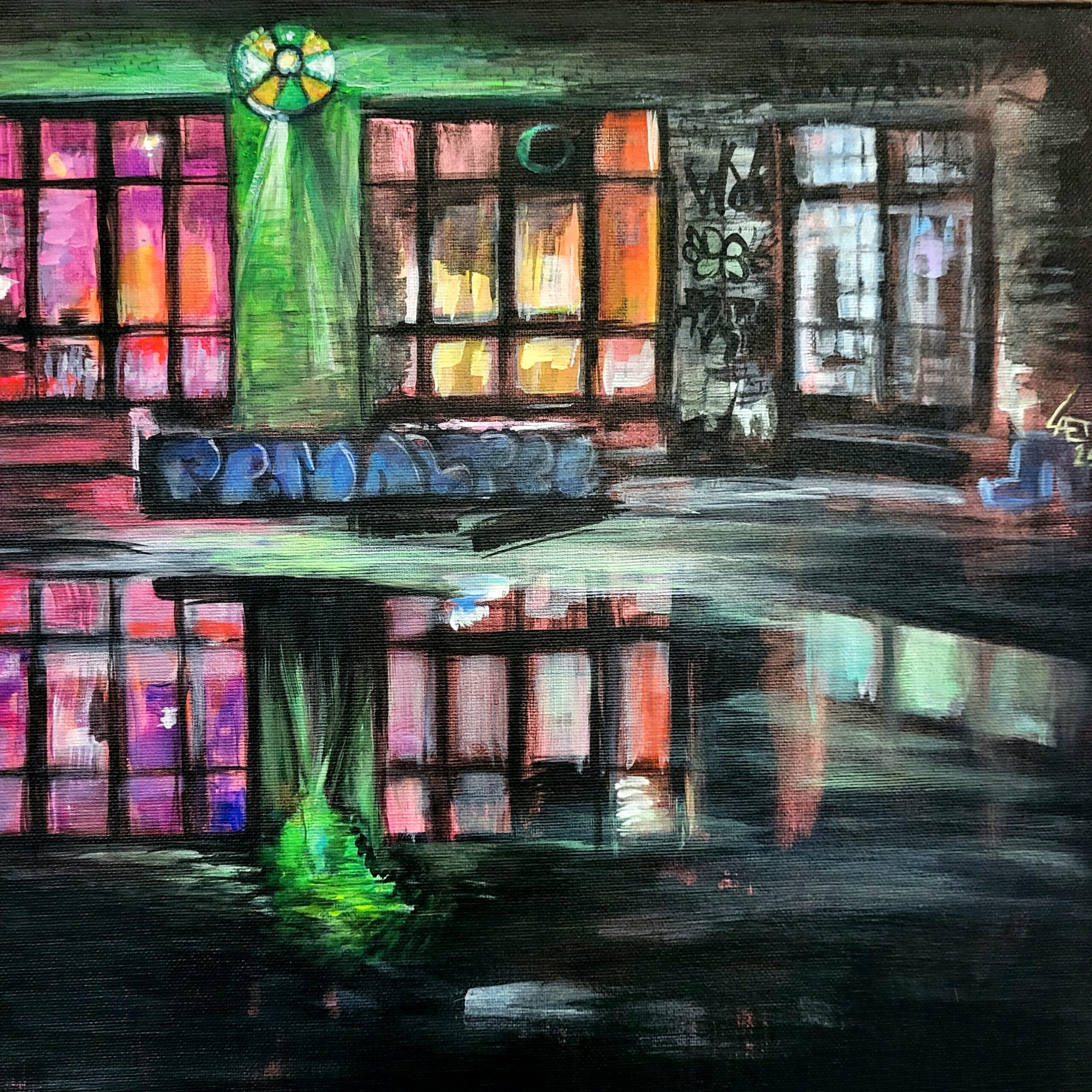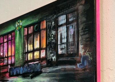 I wanted to capture the mysterious soul of a nighttime moment, where colorful lights vibrate on the water, blending figuration and impressionism. Using acrylic paint, I sought to reveal an atmosphere that is both tangible and metaphysical, inviting the viewer to immerse themselves in an urban reverie. This work fills the space with a gentle, almost hypnotic energy that illuminates the darkness with warmth and poetry.