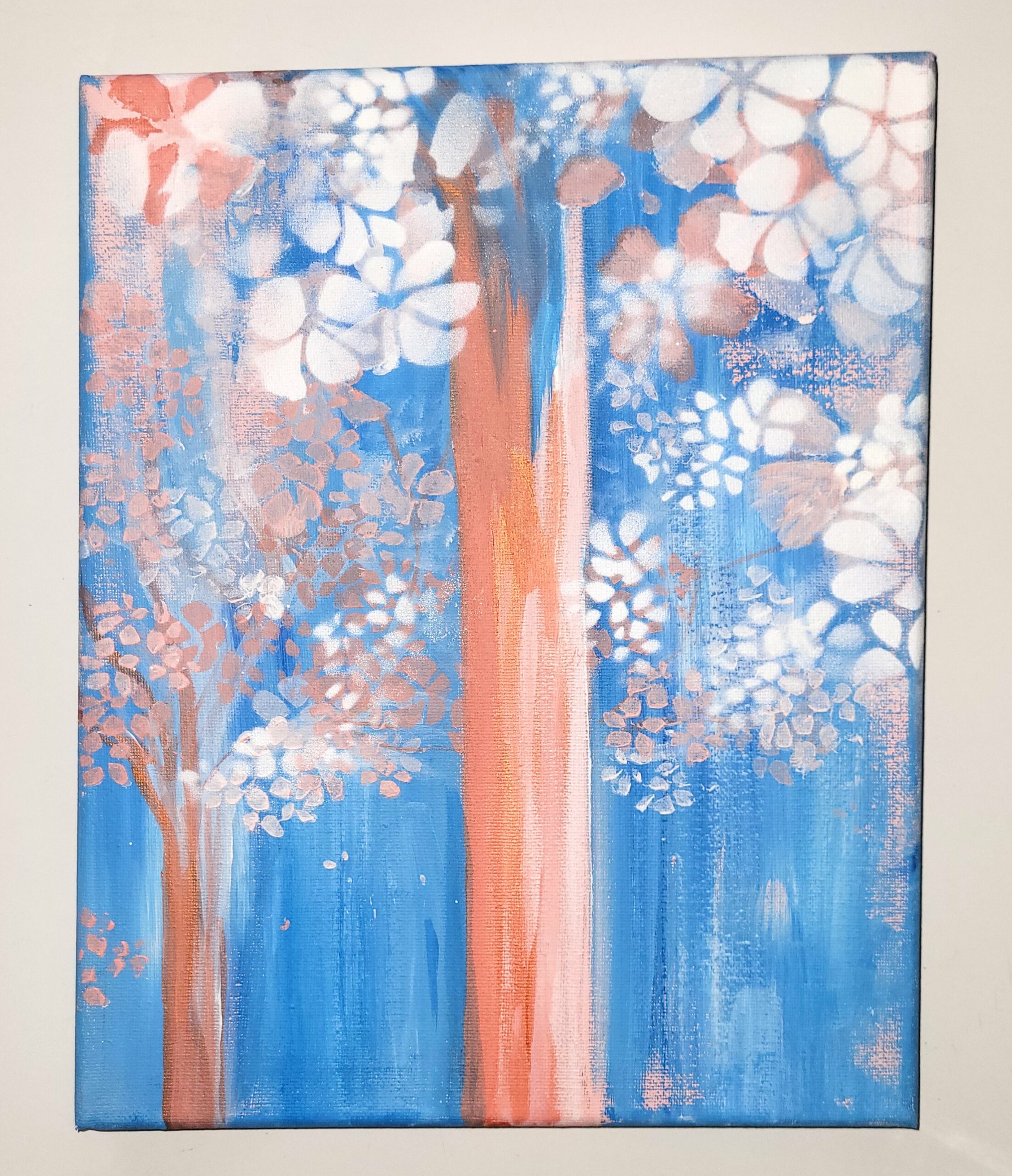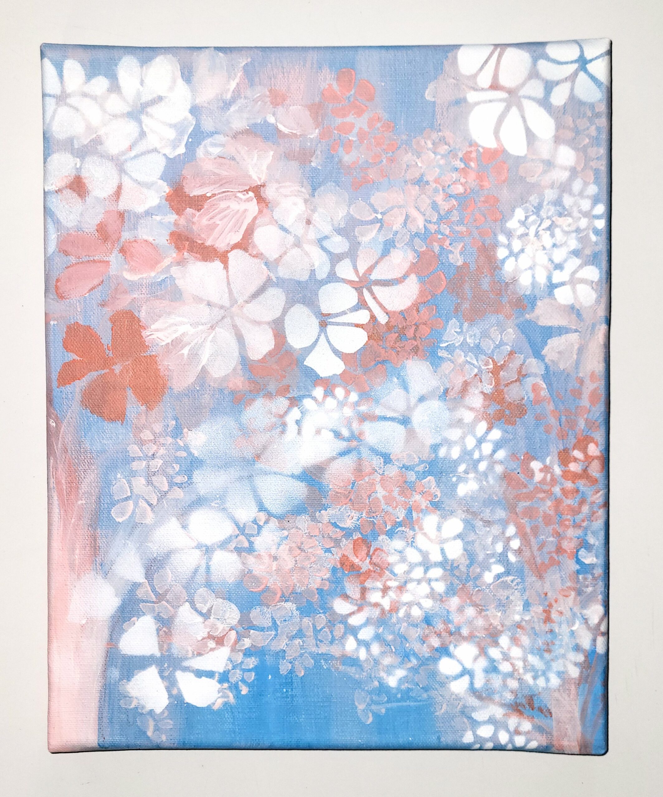 acrylic colors (iridescent coral orange, cyan blue, white) and white spray (stencils work) –