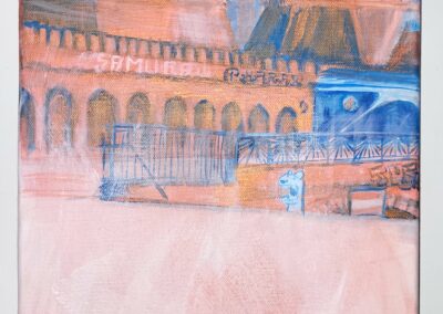 This painting represents the old border between the districts Kreuzberg and Friedrichshain. The bridge was a check point during the cold war.